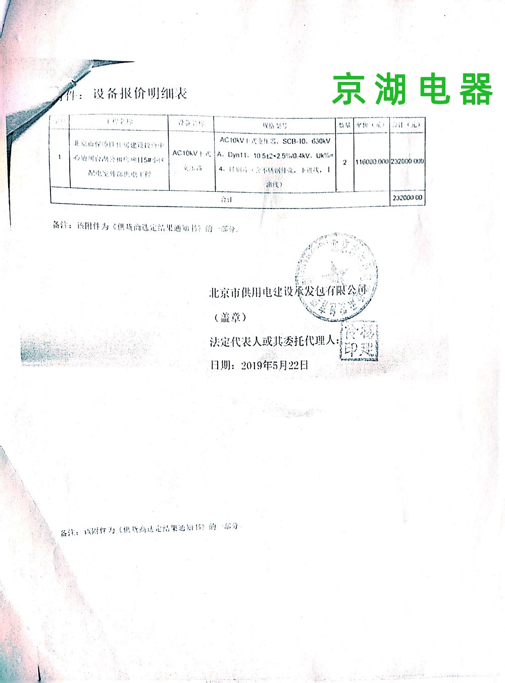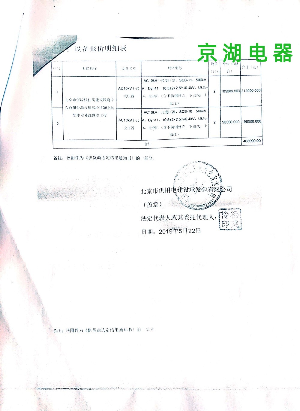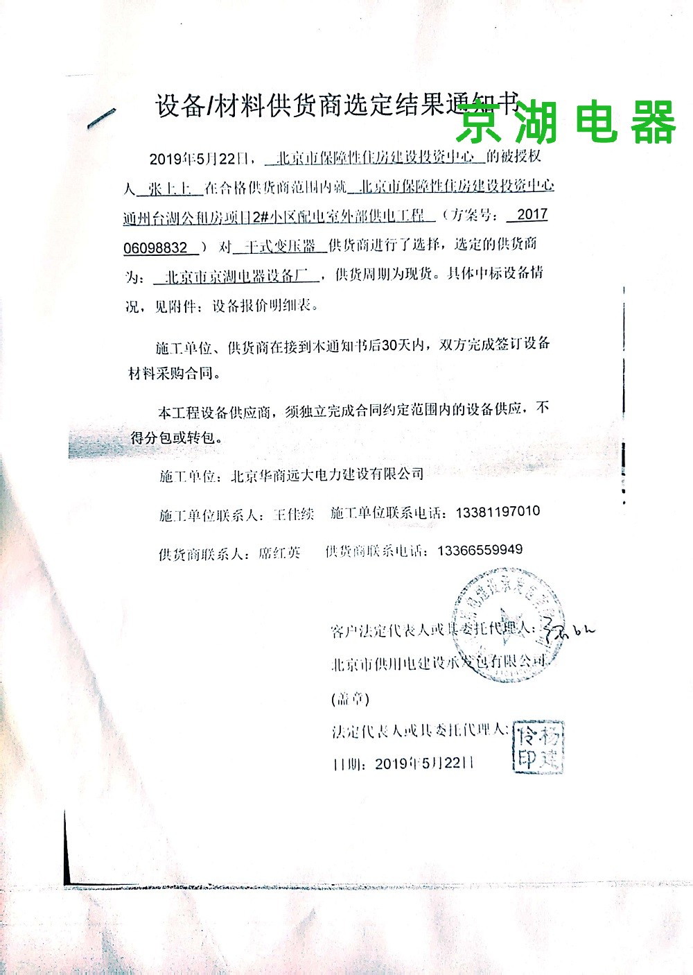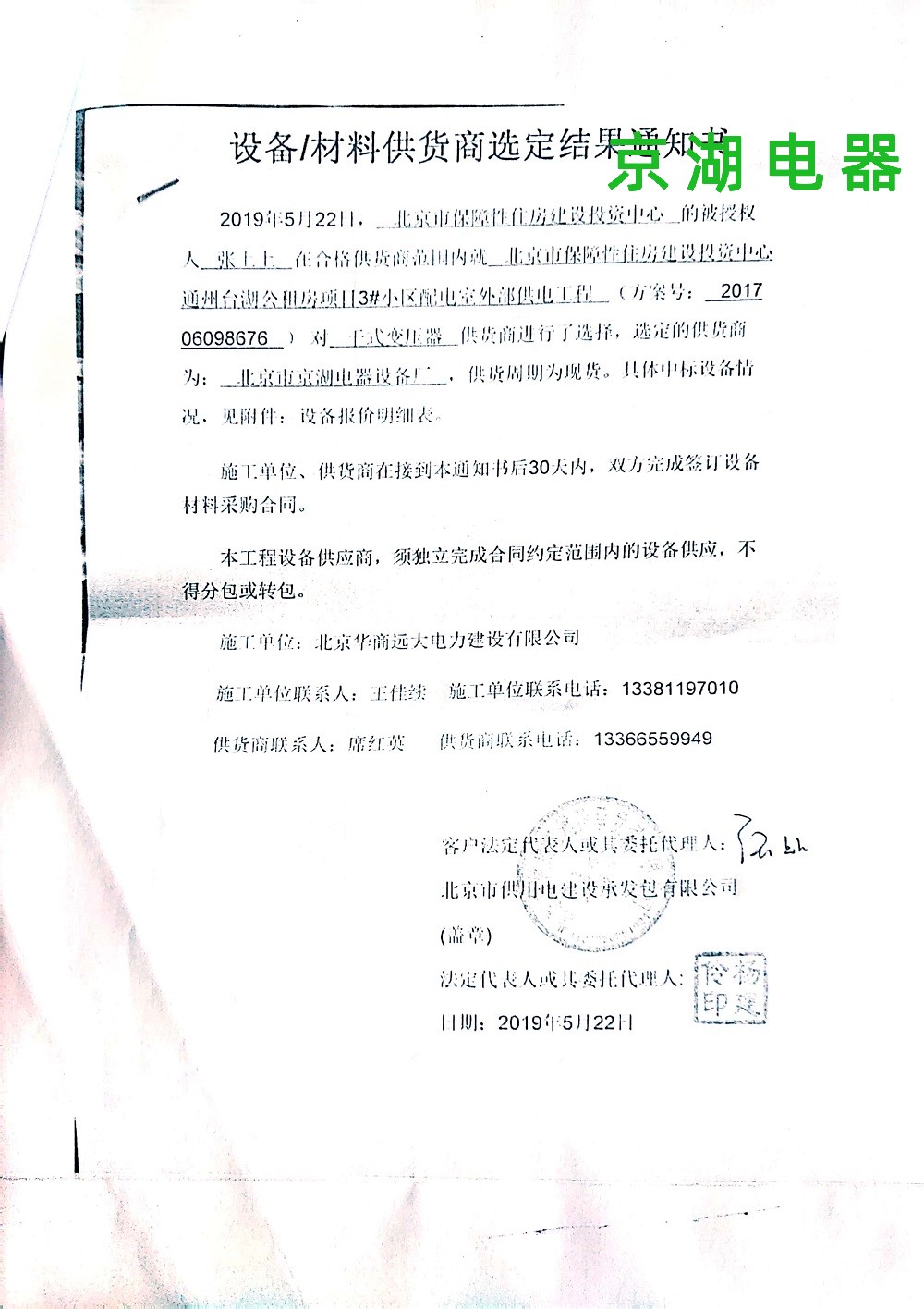 北京市保障性住房建設(shè)投資中心 供貨商選定結(jié)果通知書(shū) 2019年5月22日